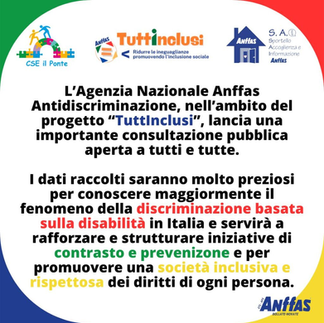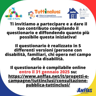 Maggiori informazioni e i link per responsabili e per chi lavora nei servizi le puoi trovare su: https://www.anffas.net/it/progetti-e-campagne/tuttinclusi/consultazione-pubblica-tuttinclusi/Grazie per il tuo sostegno!